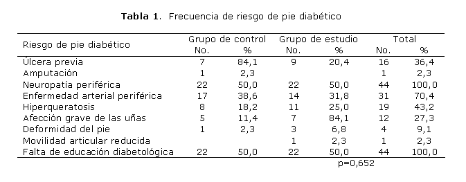 En la tabla 1 se describe la frecuencia del pie diabético de riesgo en los pacientes estudiados. Se observó que la neuropatía periférica estaba presente en todos los integrantes de la serie y la enfermedad arterial periférica, en 31 de ellos (70,4 %), de los cuales, 17 (38,6 %) correspondían al grupo de control y 14 al de estudio (31,8 %); estas afecciones constituyeron los riesgos más frecuentes.