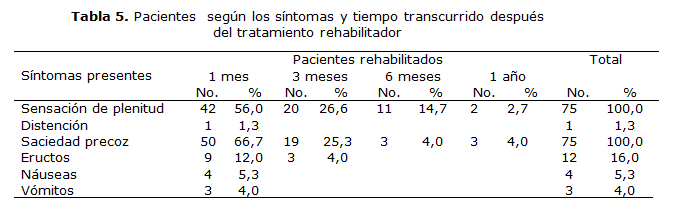La mayoría de los adultos mayores con dispepsia funcional, no presentaron un elevado porcentaje de síntomas gastroenterológicos luego del tratamiento rehabilitador (tabla 5), pues solo 2 manifestaron sensación de plenitud al año de tratamiento (2,7 %) y 3 de saciedad precoz (4,0 %).