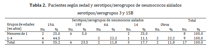 neumonía se presentó en 82,3 % y hubo 10,0 % de positividad al neumococo, por serotipos 19A, 19F, 14