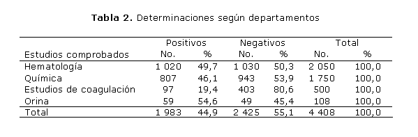 De las de determinaciones realizadas por departamentos (tabla 2), predominaron las de hematología (49,8 %), seguidas por las de química (32,5 %).