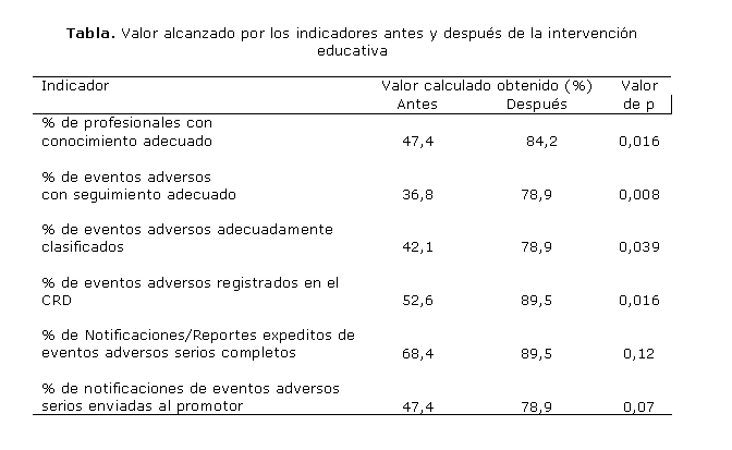 Se lograron cambios estadísticamente significativos respecto a la capacitación en cuanto al nivel de conocimientos y todos los indicadores del desempeño, excepto la clasificación de los eventos adversos y el completamiento de los modelos de notificación.