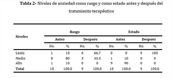 Los resultados de IDAREN muestran la categoría de ansiedad rasgo en un nivel medio, con ocho pacientes que representan 80,0 %. Un paciente presentó niveles altos de ansiedad y otro, niveles bajos, con 10,0 % cada uno, (tabla 2).