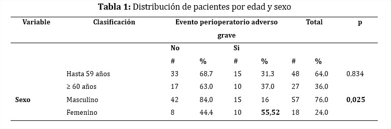En la Tabla 1 se percibe una mayoría de pacientes del sexo masculino, con edad hasta 59 años, seguidos por los adultos mayores. En el sexo femenino se manifiesta la mayor frecuencia de eventos adversos y complicaciones graves.