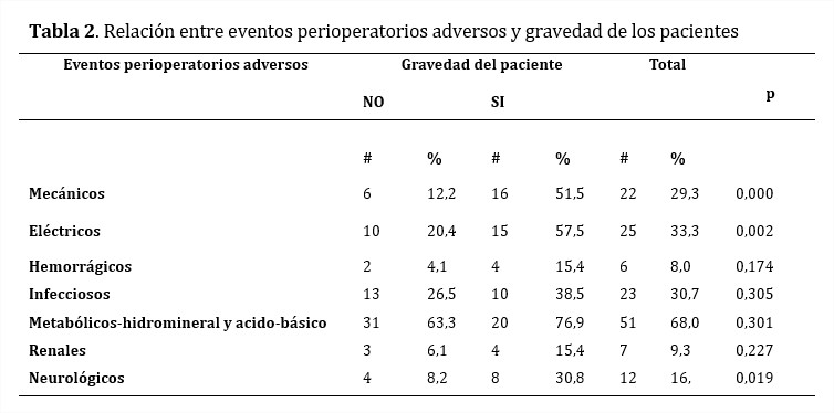 La Tabla 2 muestra la relación existente entre los eventos adversos observados y la gravedad de los pacientes: ilustra que aunque las alteraciones metabólicas y del equilibrio hidromineral y acido-básico son las más prevalentes (68,0 %) en este tipo de cirugía las que tuvieron una asociación significativa con la gravedad fueron las complicaciones mecánicas (p=0,000), eléctricas (p=0,002) y los trastornos neurológicos (p=0,019).