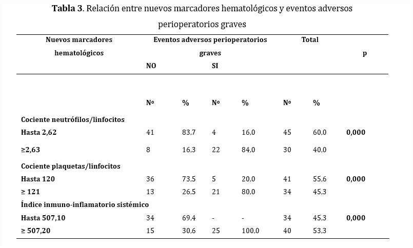 Al explorar los biomarcadores hematológicos estudiados (Tabla 3) se revela que tienen una estrecha conexión (p=0,000) con los eventos adversos relacionados con el procedimiento quirúrgico, al considerar los nuevos marcadores: cociente neutrófilos/linfocitos, cociente plaquetas/linfocitos e índice inmuno-inflamatorio sistémico.